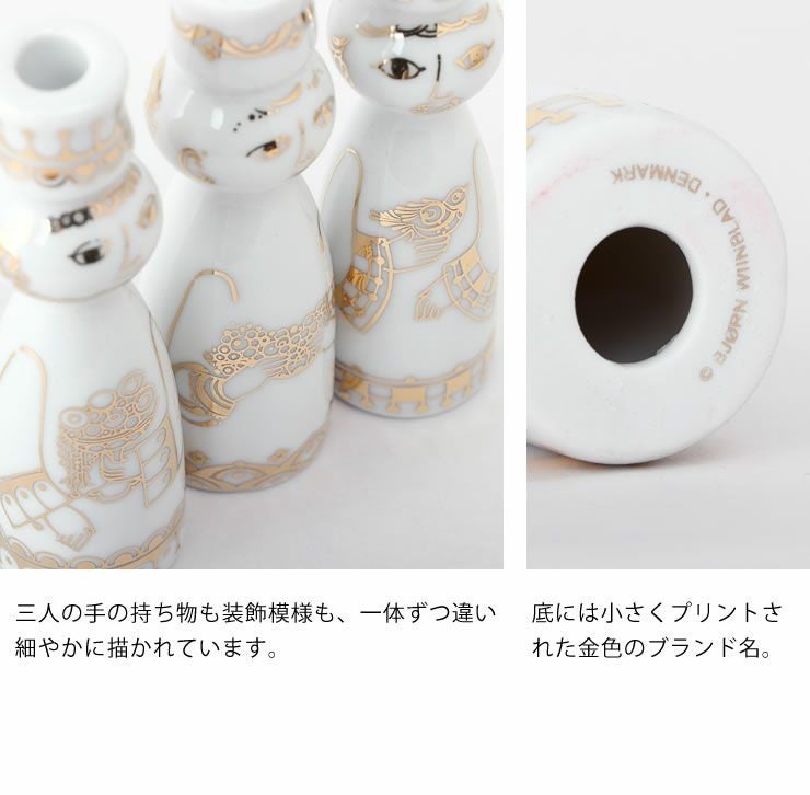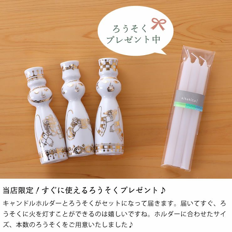 エヴァシリーズで人気のデザイナー、ビヨン・ヴィンブラッドは、キリスト降誕の物語に登場する人物をモチーフにした作品を作っており、過去のアーカイブにインスピレーションを受けて作成されたのがこのクリスマスシリーズです。モチーフになったのはキリスト礼拝のために東方からやってきた三人の賢者。白磁にゴールドで描かれた繊細な絵柄はクリスマスの雰囲気を盛り上げてくれます。直径約1.3cmのキャンドルを立てることができます。クリスマスはもちろん、オールシーズン飾れるキャンドルホルダーです。同じシリーズで集めて飾っても素敵ですね。当店限定のろうそくプレゼント企画実施中です。