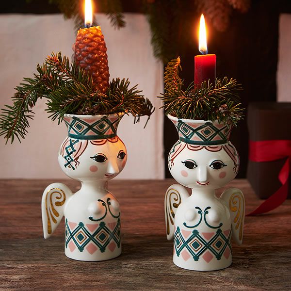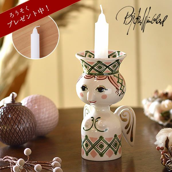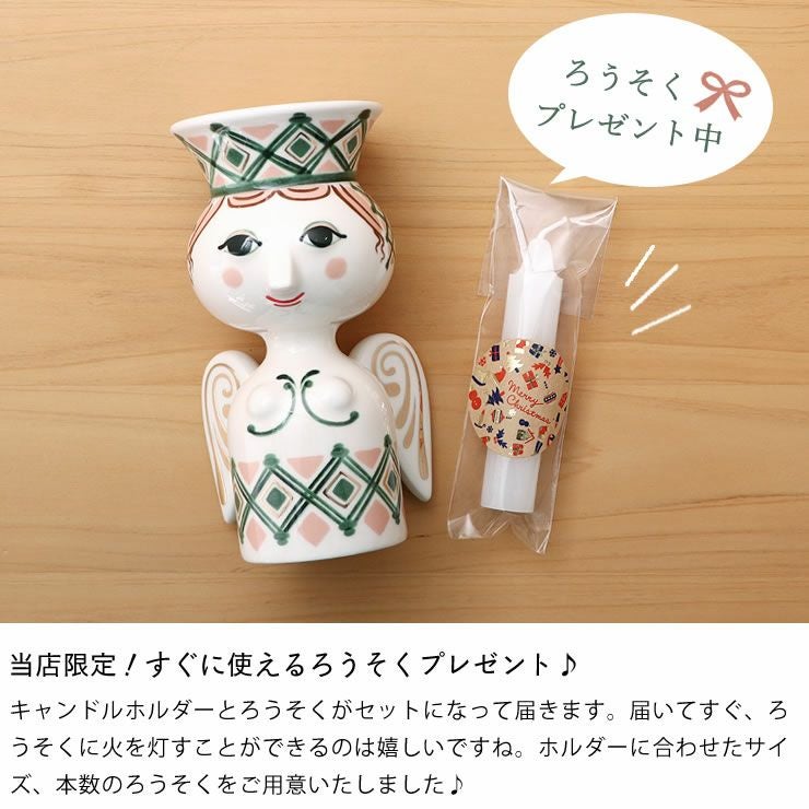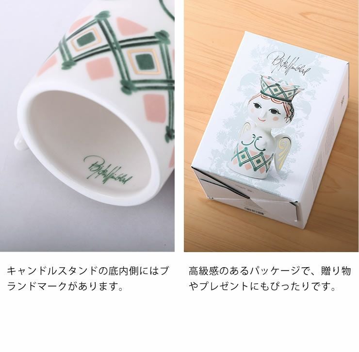 エヴァシリーズで人気のデザイナー、ビヨン・ヴィンブラッドは、キリスト降誕の物語に登場する人物をモチーフにした作品を作っており、過去のアーカイブにインスピレーションを受けて作成されたのがこのクリスマスシリーズです。モチーフになったのはクリスマスシーズンが始まる頃の北欧のお祭りでも知られる聖ルチア。白磁にグリーンやピンクで描かれた可愛い絵柄でクリスマスの雰囲気を盛り上げてくれます。直径約2cmのキャンドルを立てることができます。クリスマスはもちろん、オールシーズン飾れるキャンドルホルダーです。同じシリーズで集めて飾っても素敵ですね。当店限定のろうそくプレゼント企画実施中です。