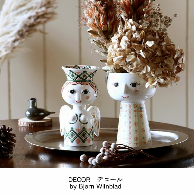 ビヨン・ヴィンブラッドの作品には強い女性像と花のモチーフが多く見られます。アーモンド型の目や三角の鼻を持つ女性の顔は彼のアイコニックな作品の一つで、それらをもとに作られたデコレーションアイテムは日常にアクセントを与えてくれます。