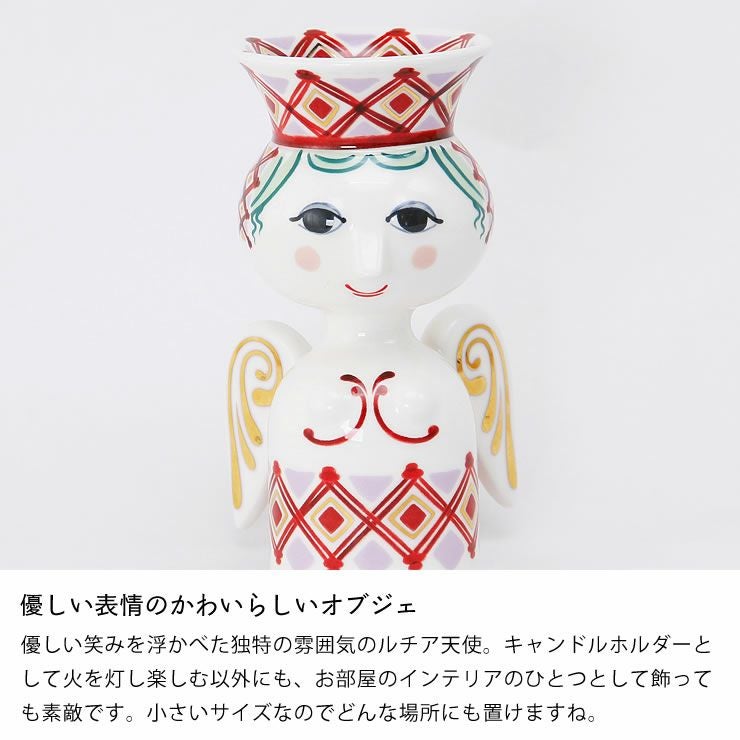 優しい笑みを浮かべた独特の雰囲気のルチア天使。キャンドルホルダーとして火を灯し楽しむ以外にも、お部屋のインテリアのひとつとして飾っても素敵です。小さいサイズなのでどんな場所にも置けますね。