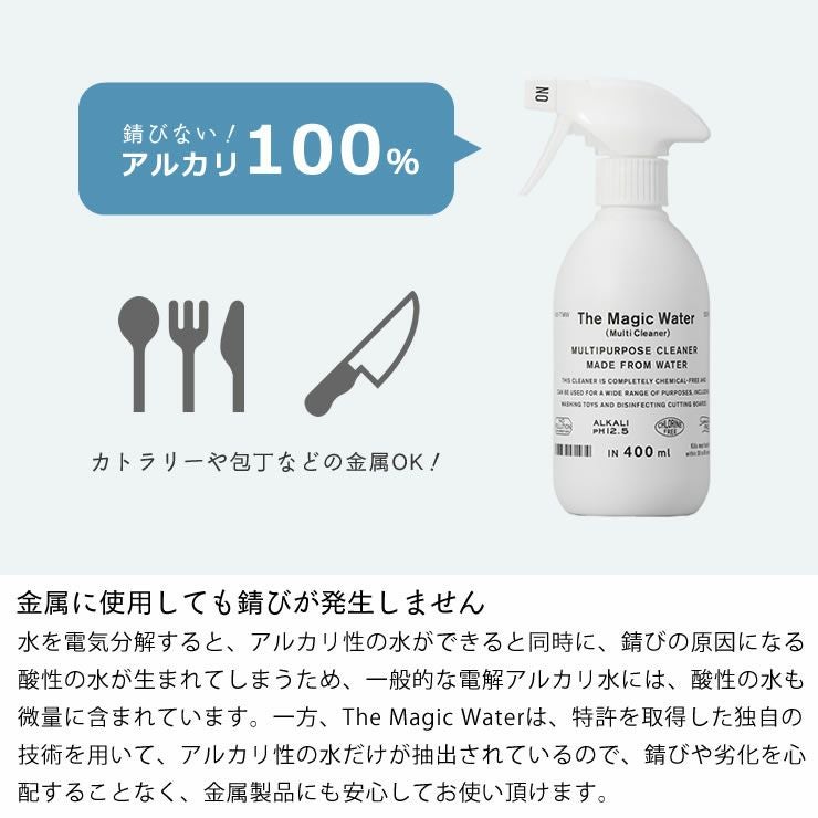 The Magic Waterは、キッチンのしつこい油汚れやおもちゃの洗浄、トイレ周りの除菌にも効果を発揮する、水から生まれたマルチクリーナーです。pH12.5と高アルカリ電解水で、様々な油汚れを落としてくれます。