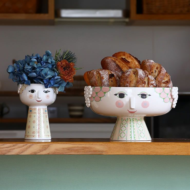 ビヨン・ヴィンブラッドの作品には強い女性像と花のモチーフが多く見られます。アーモンド型の目や三角の鼻を持つ女性の顔は彼のアイコニックな作品の一つで、それらをもとに作られたデコレーションアイテムは日常にアクセントを与えてくれます。