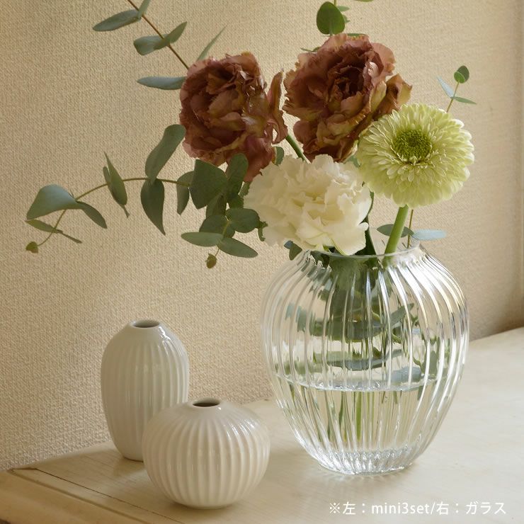 「ハンマースホイ」はデンマークの著名な画家の弟で陶芸家のスベン・ハンマースホイが 20世紀初頭に手がけた作品からインスピレーションを受け、デザインされたシリーズです。ハンマースホイシリーズは、スベンが残した芸術的なデザインに、実用性を備えた完璧なフォルムとモダンなカラーが施され、フラワーベースやテーブルウェアのアイテムとして現代に生まれ変わりました。2015年に登場して一躍人気となり、新たな定番としてデンマークの多くの家庭で愛用されています。優しい丸みに縦ラインの陰影が美しいガラスのフラワーベースです。
