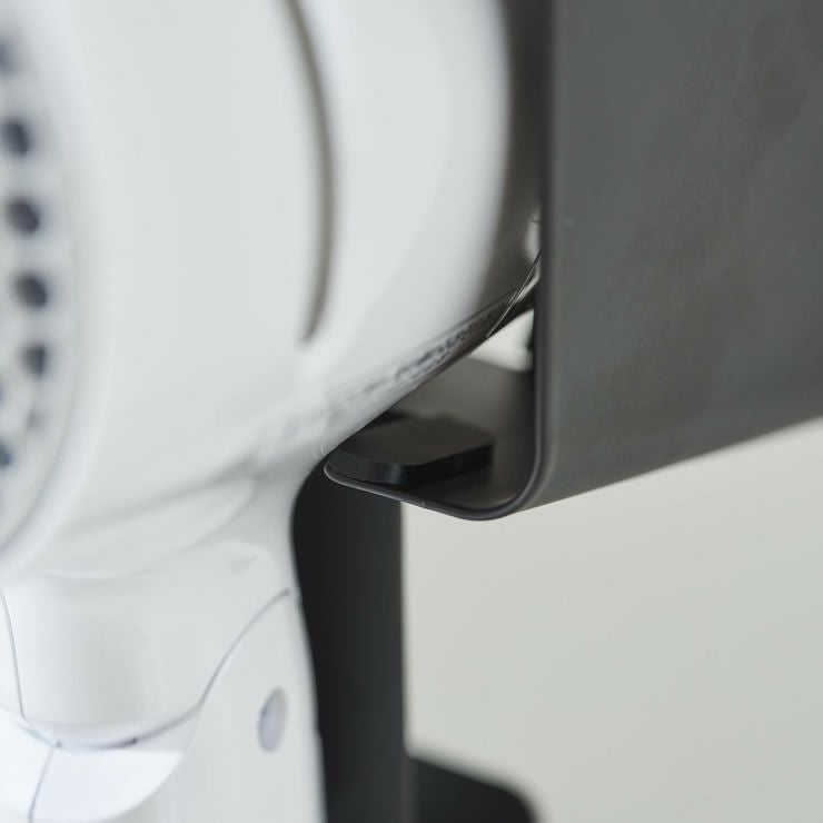 ドライヤーは横から差し込むだけで収納できます。引っ掛けて吊るすシンプルな構造で、無駄なスペースを取らず、コンパクトに収納できます。