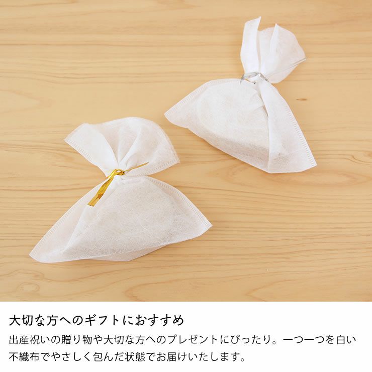 出産祝いの贈り物や大切な方へのプレゼントにぴったり。一つ一つを白い不織布でやさしく包んだ状態でお届けいたします。