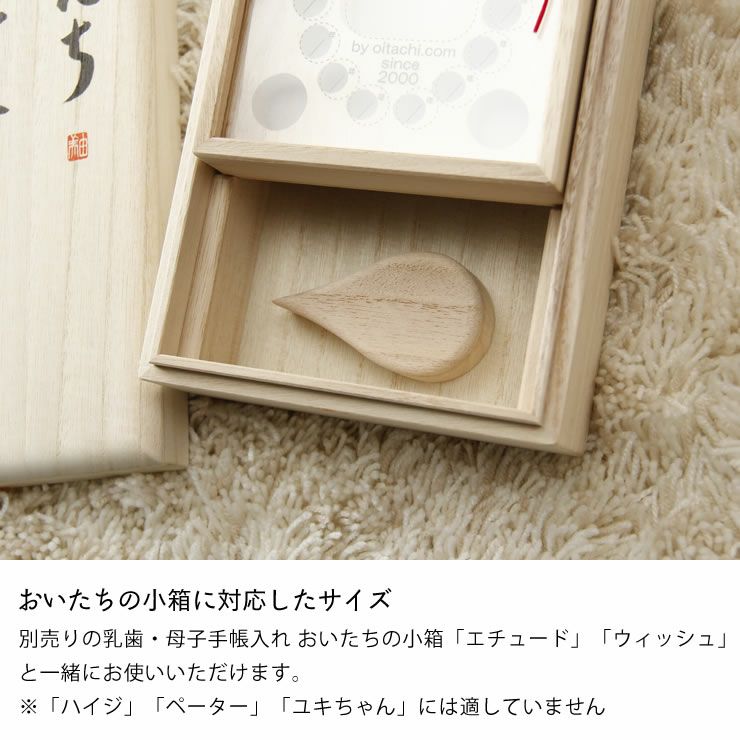 別売りの乳歯・母子手帳入れ「おいたちの小箱」と一緒にお使いいただけます。