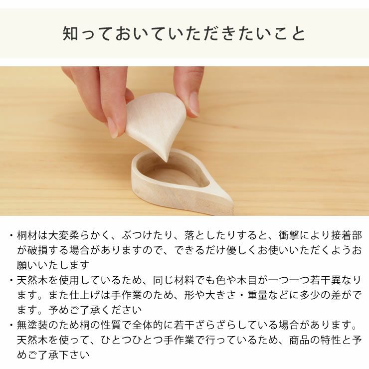 ・桐材は大変柔らかく、ぶつけたり、落としたりすると、衝撃により接着部が破損する場合がありますので、できるだけ優しくお使いいただくようお願いいたします