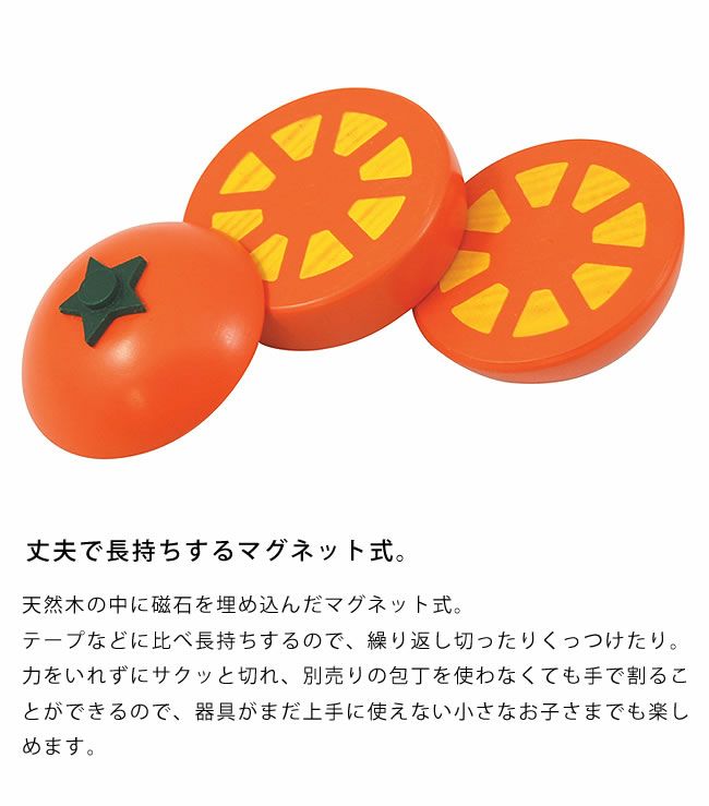 お子さまの手になじむ大きさと、本物のような切り口のデザインが人気の木製おままごとアイテム。マグネットなので、簡単に切ることができ、くっつけたり離したり何度も遊ぶことができます。遊びを通し野菜や果物をひとつひとつ教えてあげることで、本物の野菜や果物の名前を覚えるお勉強にもなります。
