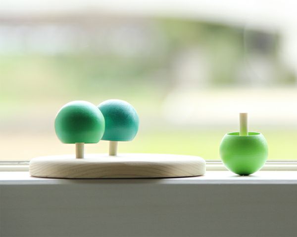 まんまるの木をイメージした可愛い3つのコマ。置いて飾っているだけでもほっこり癒されます。コマのように回すとクルッと逆立ちする仕組みになっており、コマから木に変身!その動きがくせになるアイデアいっぱいのおもちゃです。