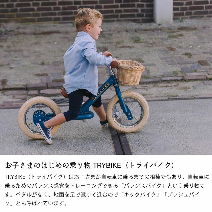 TRYBIKE(トライバイク)はお子さまが自転車に乗るまでの相棒でもあり、自転車に乗るためのバランス感覚をトレーニングできる「バランスバイク」という乗り物です。ペダルがなく、地面を足で蹴って進むので「キックバイク」「プッシュバイク」とも呼ばれています。