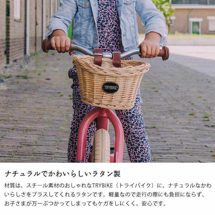 材質は、スチール素材のおしゃれなTRYBIKE(トライバイク)に、ナチュラルなかわいらしさをプラスしてくれるラタンです。軽量なので走行の際にも負担にならず、お子さまが万一ぶつかってしまってもケガをしにくく、安心です。