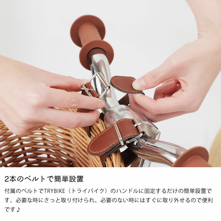 付属のベルトでTRYBIKE(トライバイク)のハンドルに固定するだけの簡単設置です。必要な時にさっと取り付けられ、必要のない時にはすぐに取り外せるので便利です♪