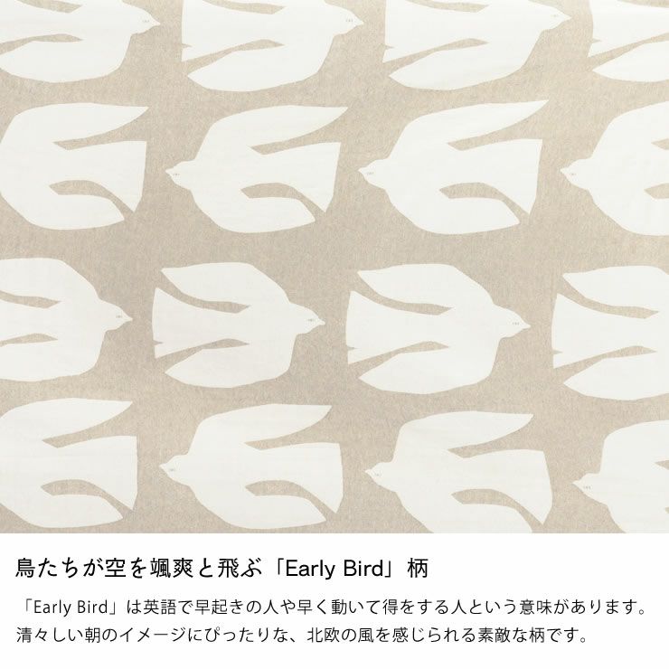 「Early Bird」は英語で早起きの人や早く動いて得をする人という意味があります。清々しい朝のイメージにぴったりな、北欧の風を感じられる素敵な柄です。