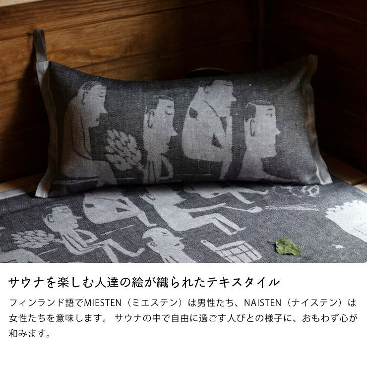 サウナ内でリラックスするためには欠かせない、サウナピロー。サウナでの使用以外には、ビーチやプール、ピクニックやキャンプなどのアウトドアでの利用がおすすめです。軽いので持ち運びにも便利で、速乾性に優れたリネンは水辺の使用でも安心。お部屋の中でごろんと、「ちょっとお昼寝」のときにも重宝します。人気のフィンランド人デザイナー、マッティ・ピックヤムサがサウナを楽しむ人達を描いたシリーズ。NAISTEN(ナイステン)は女性たち。MIESTEN(ミエステン)は男性たち。女性に比べるとやや苦しそうな表情で、じっと耐えている様子が伺えます。