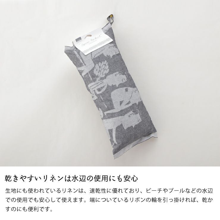 生地にも使われているリネンは、速乾性に優れており、ビーチやプールなどの水辺での使用でも安心して使えます。端についているリボンの輪を引っ掛ければ、乾かすのにも便利です。