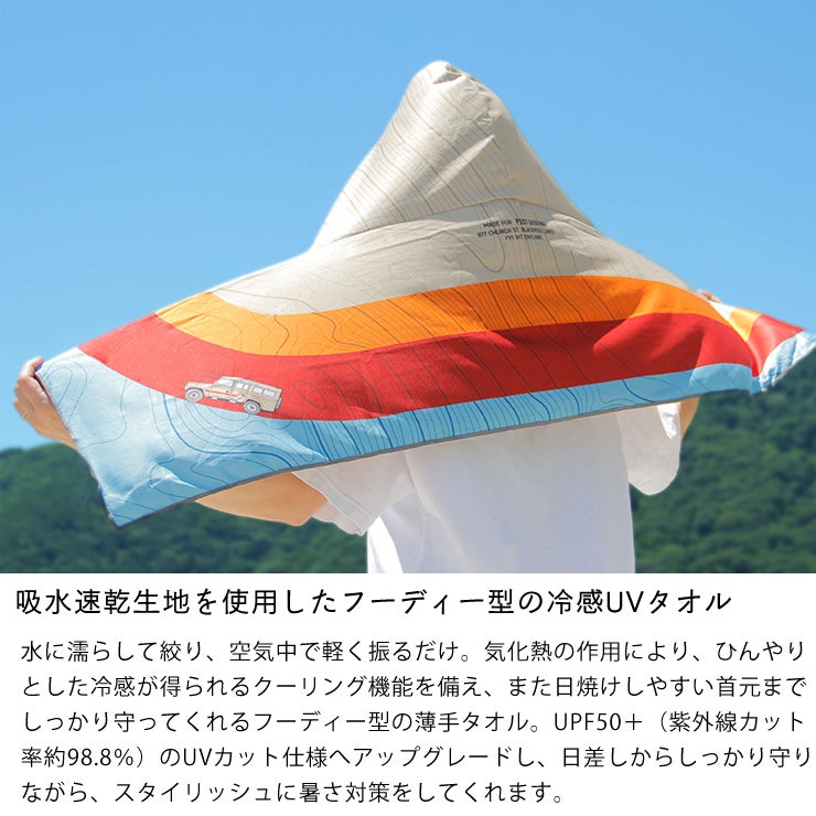 気化熱の作用により、ひんやりとした冷感が得られるクーリング機能を備え、また日焼けしやすい首元までしっかり守ってくれるフーディー型の薄手タオル。