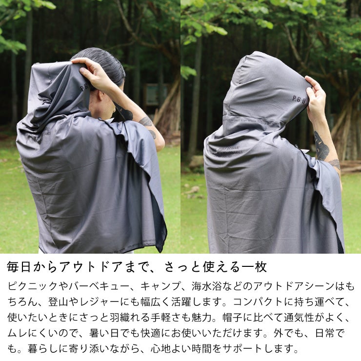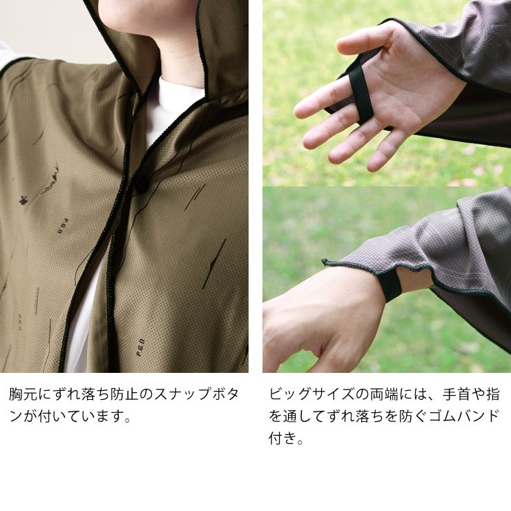 ポンチョのようにさっと被れるゆとりのある設計。身体全体を包み込むように覆えるため、より広い範囲で涼しさを感じていただけます。端にはゴムバンドが付いており、手首や指に通すことで腕や手の甲までしっかりカバーできます。