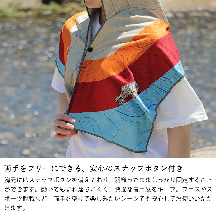 胸元にはスナップボタンを備えており、羽織ったまましっかり固定することができます。動いてもずれ落ちにくく、快適な着用感をキープ。フェスやスポーツ観戦など、両手を空けて楽しみたいシーンでも安心してお使いいただけます。