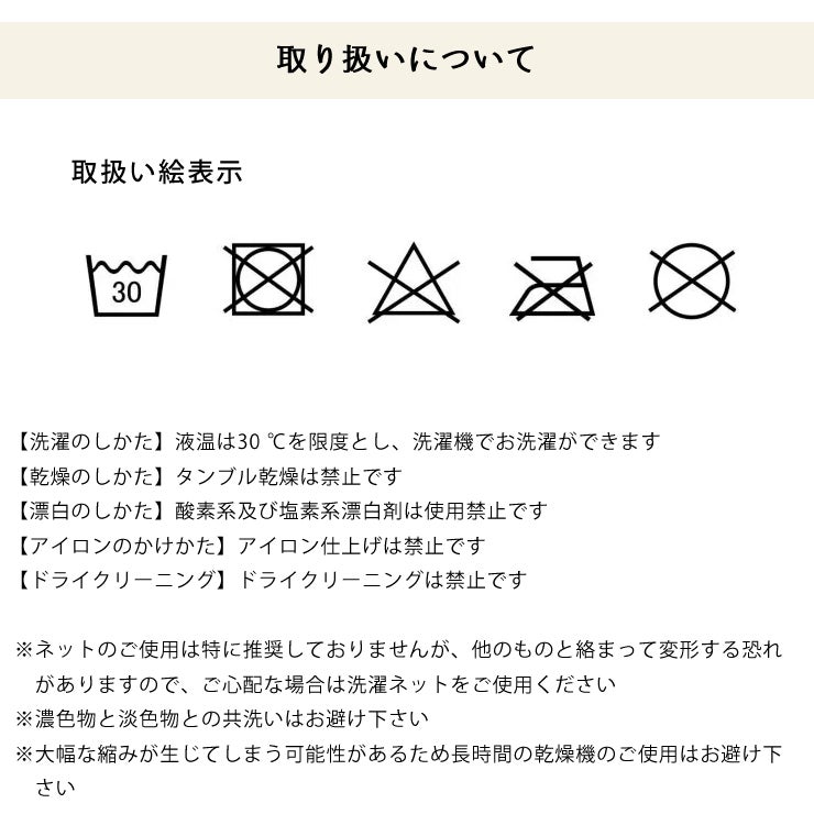 ※大幅な縮みが生じてしまう可能性があるため長時間の乾燥機のご使用はお避け下さい