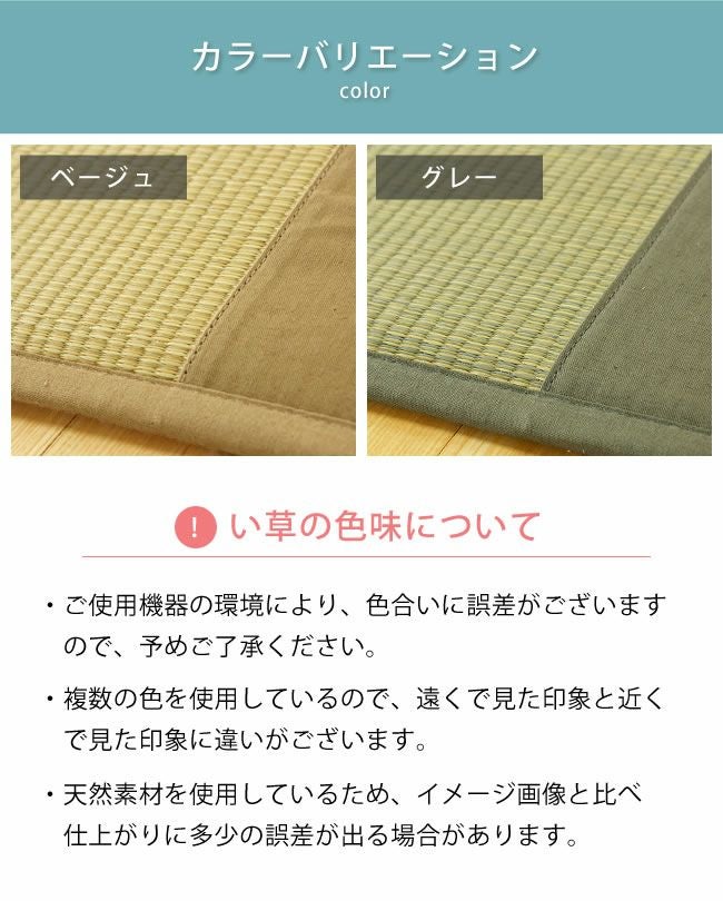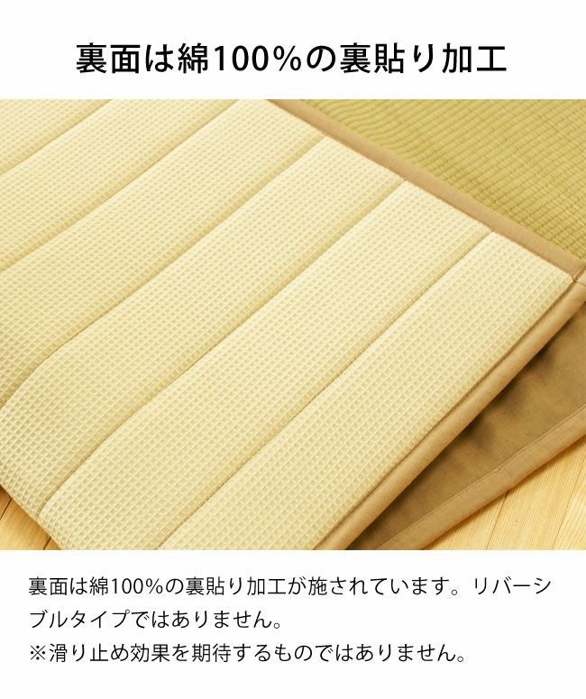 | 材質 | 国産い草100% 縁:綿85%・麻15% 中身:ポリエステル硬綿 裏面:布地 綿100% |