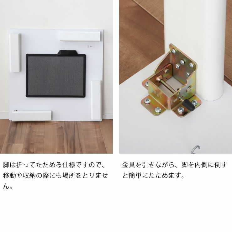 フラットヒーターで足元すっきり。春夏シーズンには、センターテーブルとして活躍します。ソファと合わせてローテーブルとしても使いやすい高さです。折れ脚タイプなので、収納の際も場所を取りません。