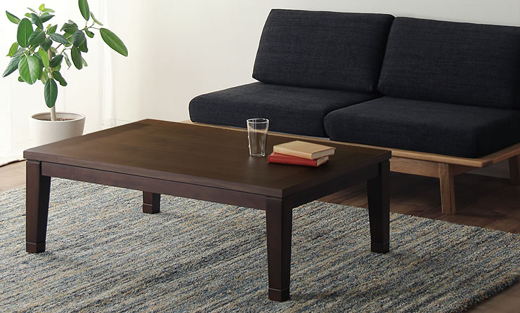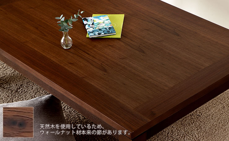 ウォールナット材の深みのある質感が上品で心やすらぐ雰囲気のこたつ。シンプルなデザインでどんなお部屋にも合わせやすいデザインです。