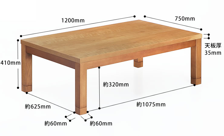 | サイズ | 幅1200×奥750×高410(mm) 天板厚 約35mm ヒーターサイズ 約290×290mm コードの長さ 約3200mm |