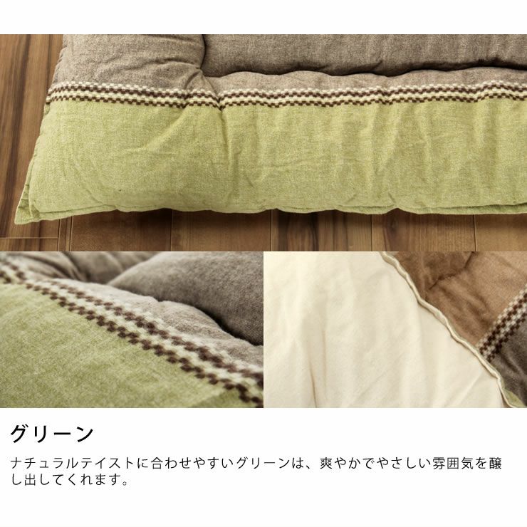 ざっくりと起毛させ、柔らかなくナチュラルな風合いに仕上げたインド綿は、洋室にも和室にもマッチします。ステッチのラインもアクセント。