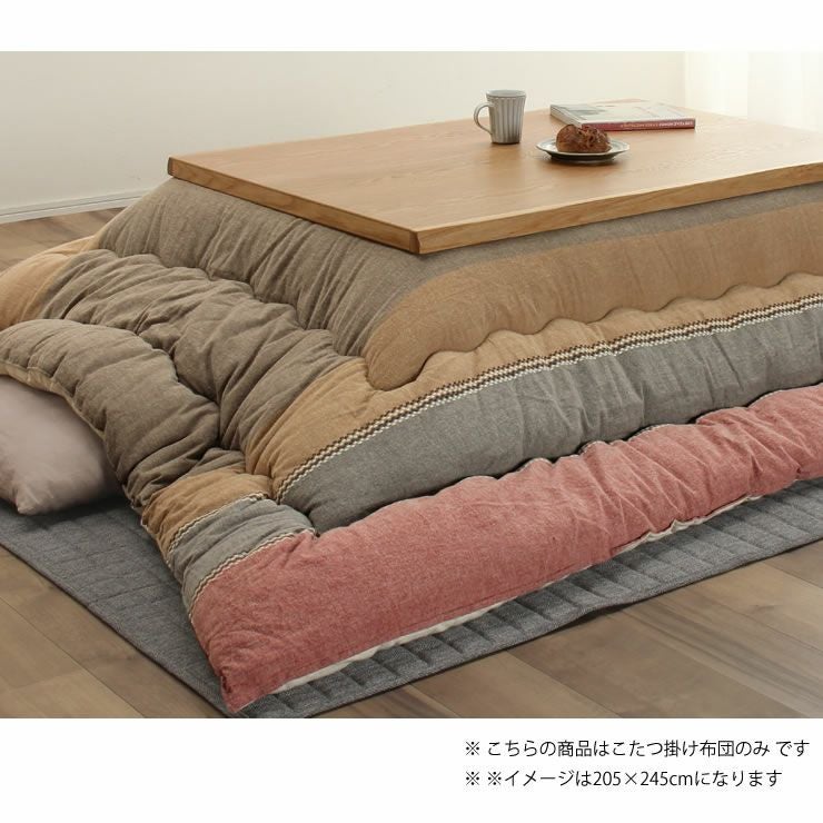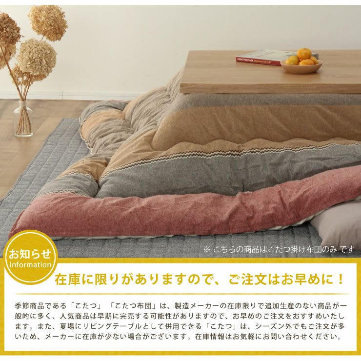 お部屋に馴染みやすいシンプルデザインの厚掛けこたつ布団。様々なインテリアにもマッチし、淡く優しい色合いとシンプルなデザインは、落ち着いたリラックスできるお部屋に演出してくれます。