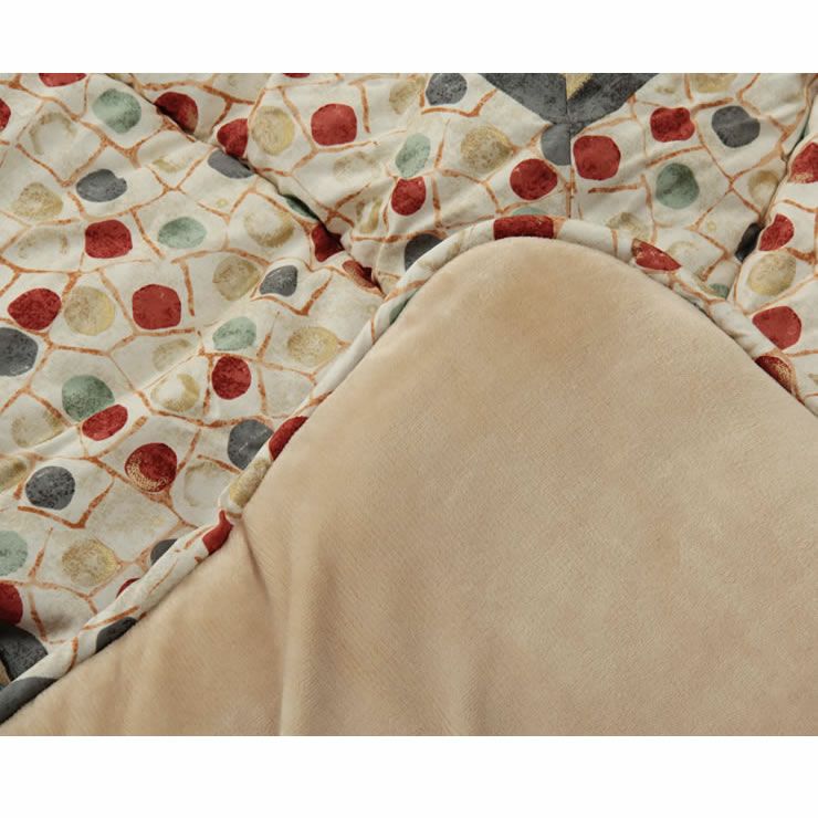 民族調のテイストに仕上げた綿素材こたつ布団です。デザインは国内でプリント工程を行う事で、より繊細・鮮明な柄を出す事が出来ました。日本製のプリントらしい、上質な質感と文様をお楽しみ下さい。肌に触れる裏地にはフランネルと呼ばれる、しっとり柔らかな生地を使用していす。又、布団が体にフィットする様にキルティングをしており(フィットキルト加工)、熱が逃げにくい形に仕上げました