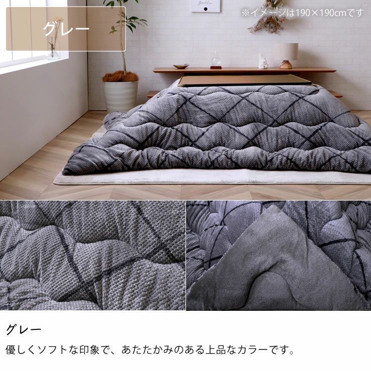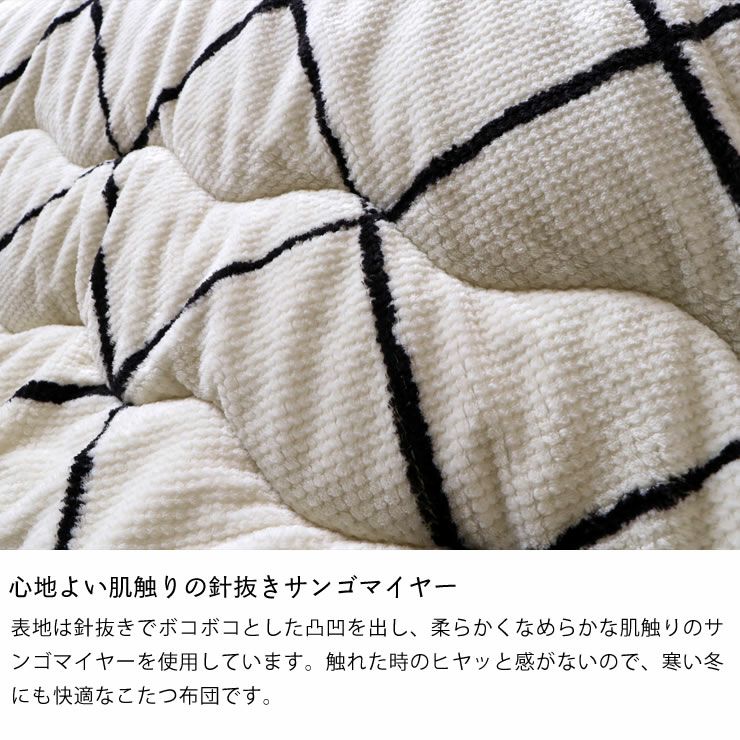 表地は針抜きでボコボコとした凸凹を出し、柔らかくなめらかな肌触りのサンゴマイヤーを使用しています。触れた時のヒヤッと感がないので、寒い冬にも快適なこたつ布団です。
