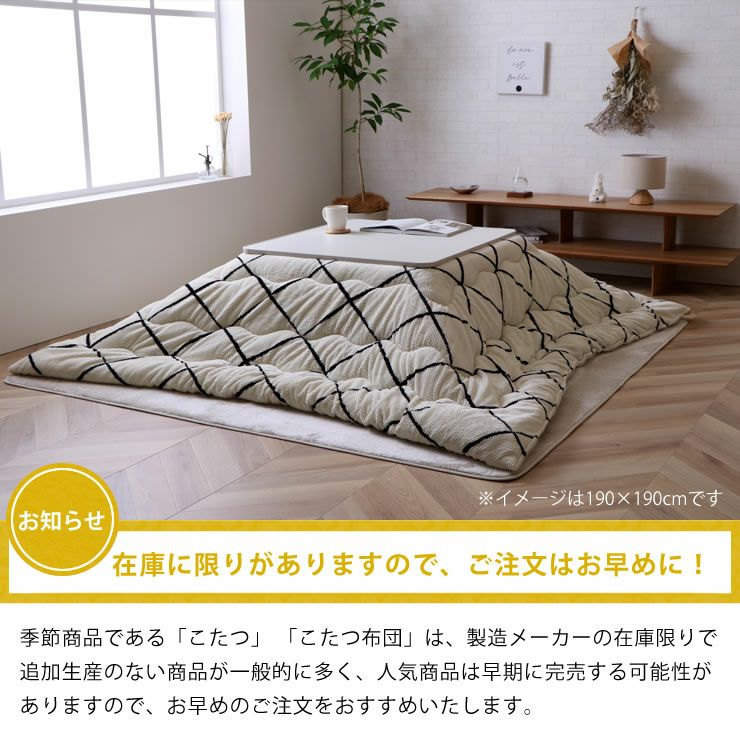 季節商品である「こたつ」 「こたつ布団」は、製造メーカーの在庫限りで追加生産のない商品が一般的に多く、人気商品は早期に完売する可能性がありますので、お早めのご注文をおすすめいたします。