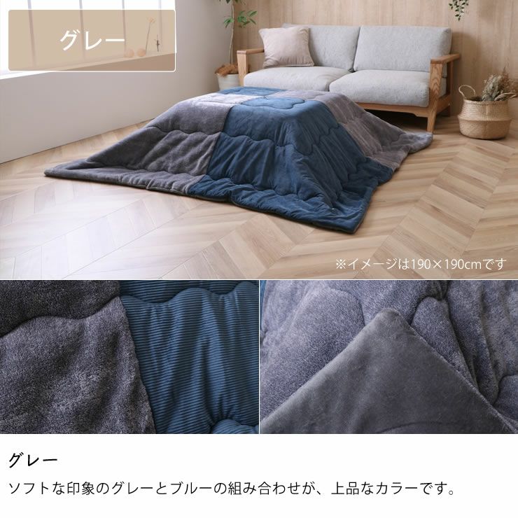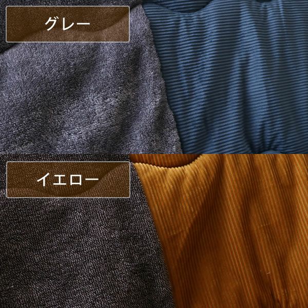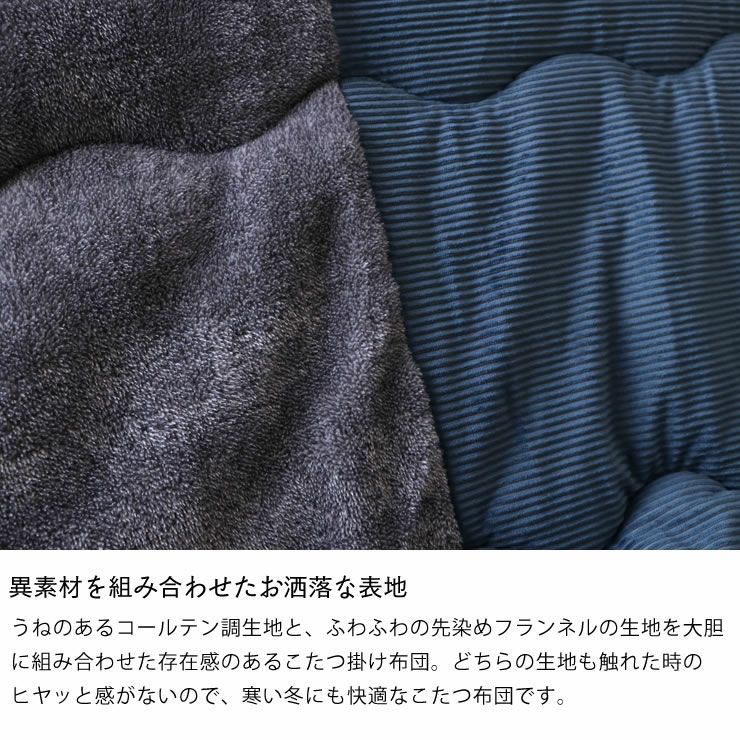 うねのあるコールテン調生地と、ふわふわの先染めフランネルの生地を大胆に組み合わせた存在感のあるこたつ掛け布団。どちらの生地も触れた時のヒヤッと感がないので、寒い冬にも快適なこたつ布団です。