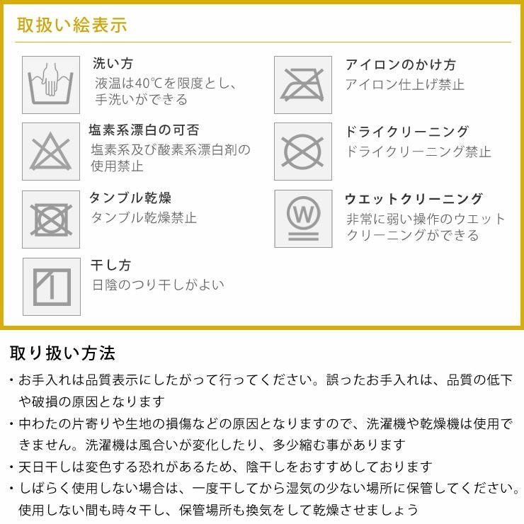 ・お手入れは品質表示にしたがって行ってください。誤ったお手入れは、品質の低下や破損の原因となります