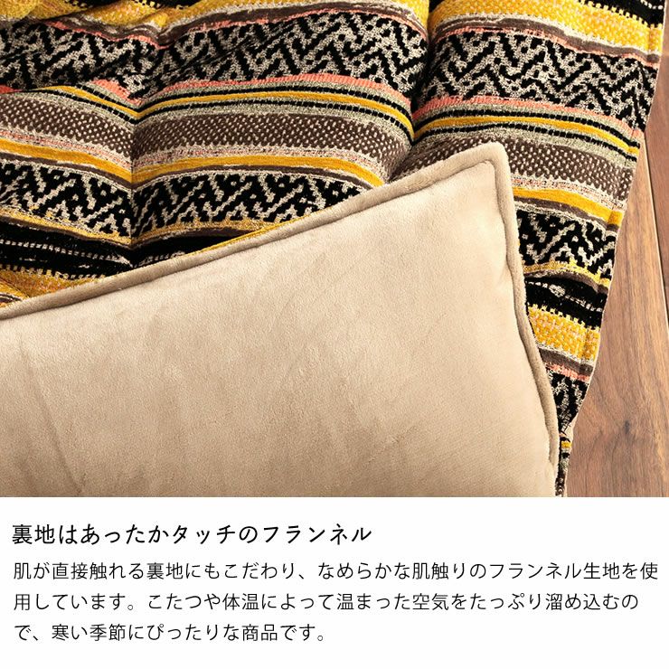 肌が直接触れる裏地にもこだわり、なめらかな肌触りのフランネル生地を使用しています。こたつや体温によって温まった空気をたっぷり溜め込むので、寒い季節にぴったりな商品です。
