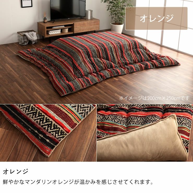 ストライプ調の中に幾何柄をデザインし、多彩な色糸を使用し織り上げた、派手さと深みのあるこたつ布団。ジャガード織で織った細かいデザインとしっかりとしたトルコ製の生地が高級感を演出してくれます。
