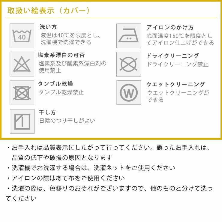 ・お手入れは洗濯表示にしたがって行ってください。誤ったお手入れは、品質の低下や破損の原因となります