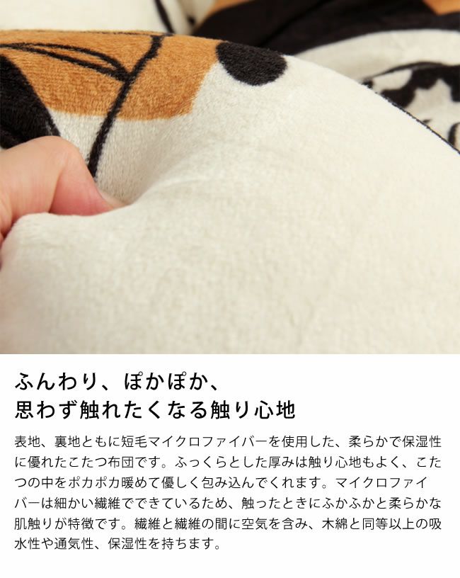 表地、裏地ともに短毛マイクロファイバーを使用した、柔らかで保湿性に優れたこたつ布団です。ふっくらとした厚みは触り心地もよく、こたつの中をポカポカ暖めて優しく包み込んでくれます。マイクロファイバーは細かい繊維でできているため、触ったときにふかふかと柔らかな肌触りが特徴です。繊維と繊維の間に空気を含み、木綿と同等以上の吸水性や通気性、保湿性を持ちます。