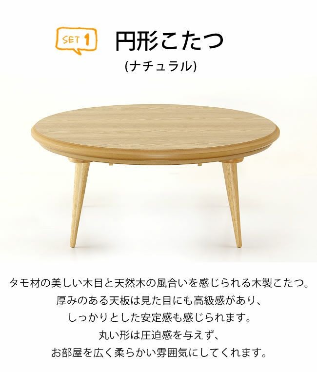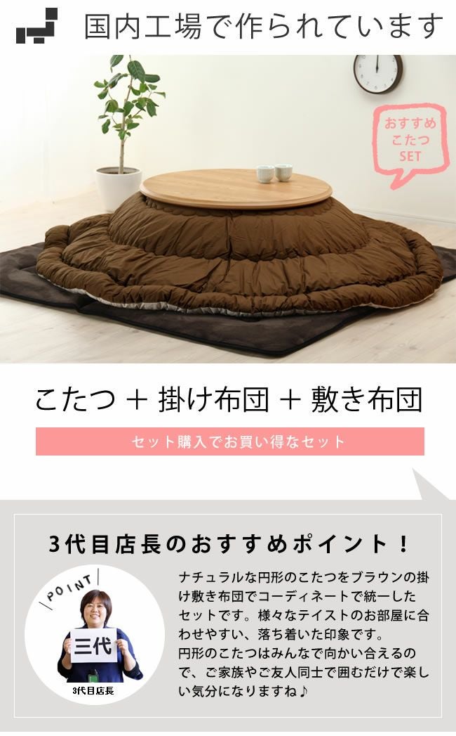 ナチュラルな円形のこたつをブラウンの掛け敷き布団でコーディネートで統一したセットです。様々なテイストのお部屋に合わせやすい、落ち着いた印象です。円形のこたつはみんなで向かい合えるので、ご家族やご友人同士で囲むだけで楽しい気分になりますね♪