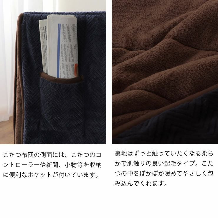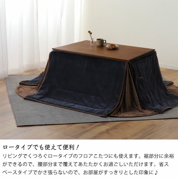 ロータイプにもハイタイプにもなる、省スペースタイプのこたつ布団。冬素材として人気の、ふんわりとした高密度なフランネル生地は、ずっと触っていたくなるなめらかなさわり心地です。