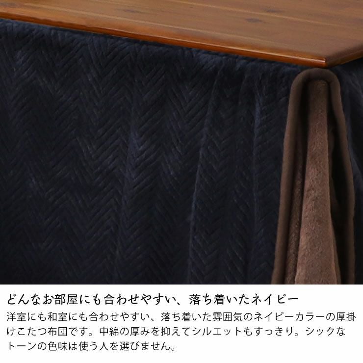 どんなお部屋にも合わせやすい、落ち着いたネイビーのパーソナルこたつ布団。すっきりとしたシルエットで洋室にも和室にも合わせやすく、落ち着いた雰囲気でシックなトーンの色味は使う人を選びません。