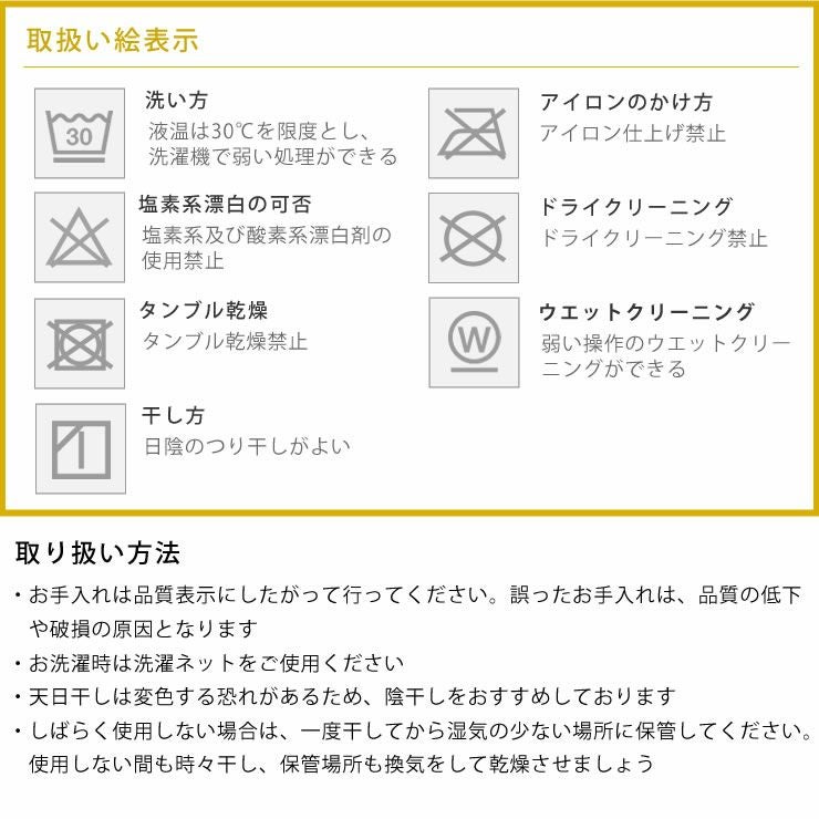 ・お手入れは品質表示にしたがって行ってください。誤ったお手入れは、品質の低下や破損の原因となります
