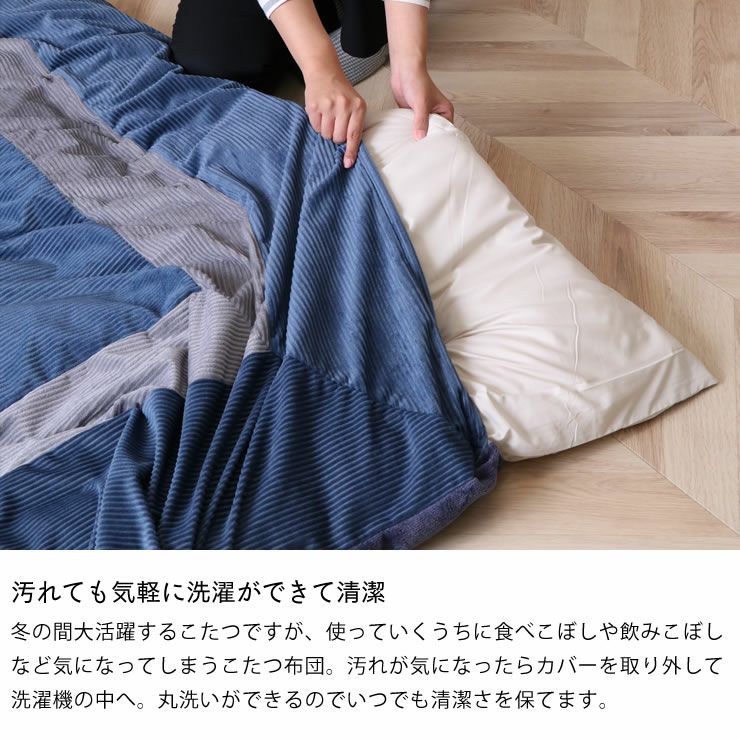 冬の間大活躍するこたつですが、使っていくうちに食べこぼしや飲みこぼしなど気になってしまうこたつ布団。汚れが気になったらカバーを取り外して洗濯機の中へ。丸洗いができるのでいつでも清潔さを保てます。汚してしまいがちな、小さいお子さまや、猫や犬などペットのいるご家庭でも安心してお使いいただけます。