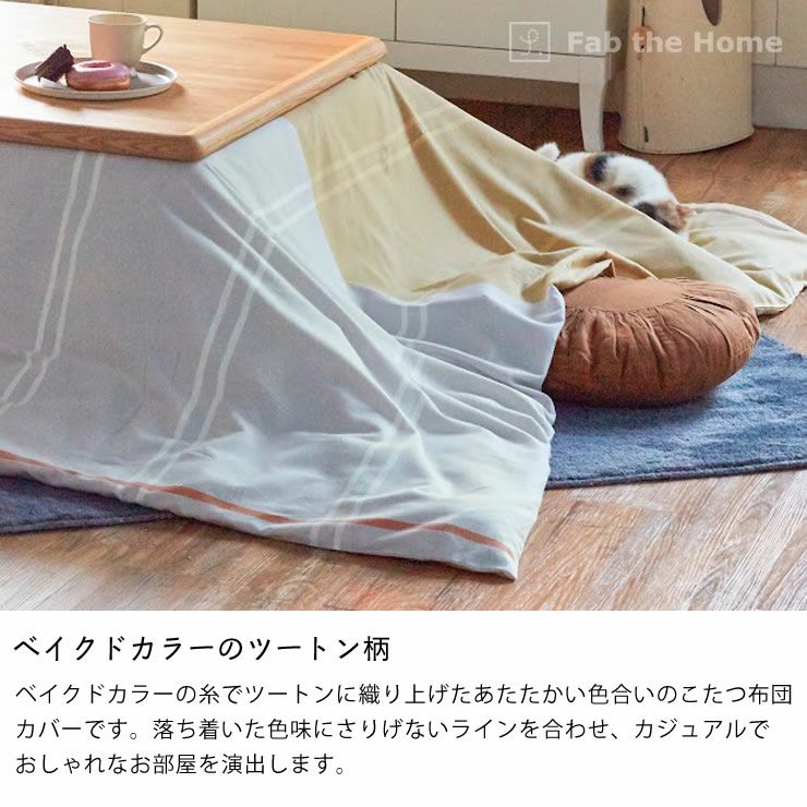 ベイクドカラーの糸でツートンに織り上げたあたたかい色合いのこたつ布団カバーです。落ち着いた色味にさりげないラインを合わせ、カジュアルでおしゃれなお部屋を演出します。