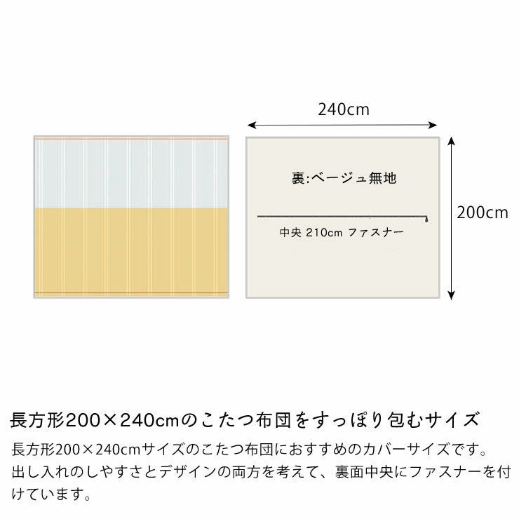 長方形200×240cmサイズのこたつ布団におすすめのカバーサイズです。出し入れのしやすさとデザインの両方を考えて、裏面中央にファスナーを付けています。