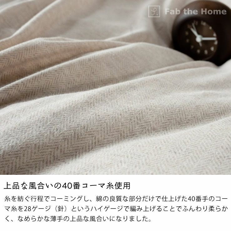 糸を紡ぐ行程でコーミングし、綿の良質な部分だけで仕上げた40番手のコーマ糸を28ゲージ(針)というハイゲージで編み上げることでふんわり柔らかく、なめらかな薄手の上品な風合いになりました。