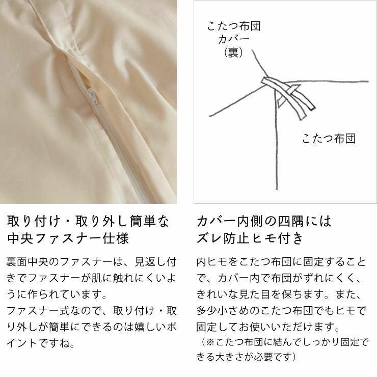 内ヒモをこたつ布団に固定することで、カバー内で布団がずれにくく、きれいな見た目を保ちます。また、多少小さめのこたつ布団でもヒモで固定してお使いいただけます。