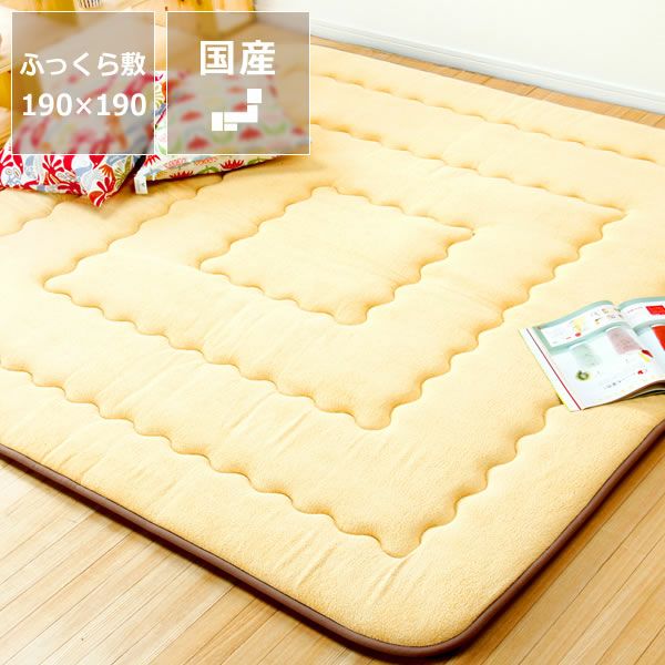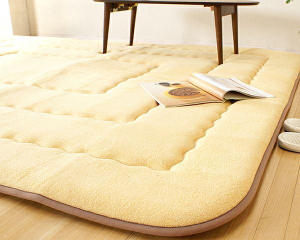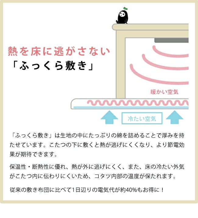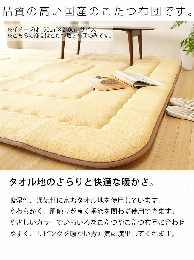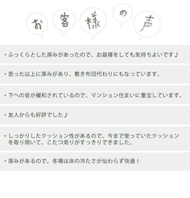 表地には吸湿性、通気性に富むタオル地を使用しています。やわらかく、肌触りが良く季節を問わず使用できます。中材にはクッション性にこだわった国産の固綿40mmを使用しています。十分な弾力性があるのでフローリングでのご使用にも最適です。遮音特級LL-30を取得しています。床下への騒音も軽減します。また、こたつと併用するとこたつの熱を床下へ逃しにくくなるので省エネ効果もあります。