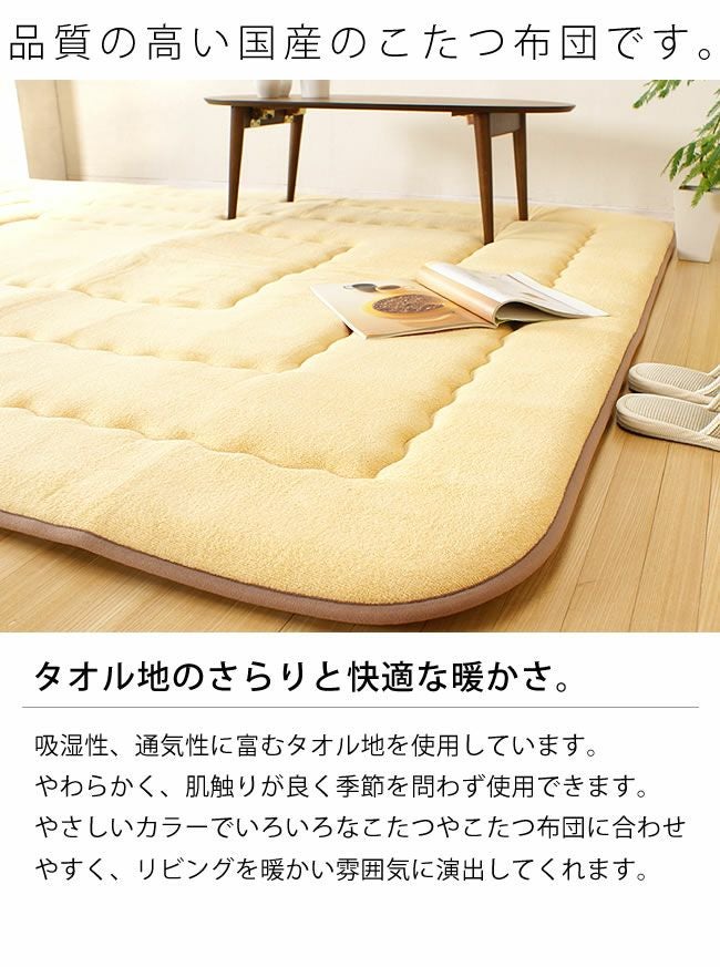 表地には吸湿性、通気性に富むタオル地を使用しています。やわらかく、肌触りが良く季節を問わず使用できます。中材にはクッション性にこだわった国産の固綿40mmを使用しています。十分な弾力性があるのでフローリングでのご使用にも最適です。遮音特級LL-30を取得しています。床下への騒音も軽減します。また、こたつと併用するとこたつの熱を床下へ逃しにくくなるので省エネ効果もあります。