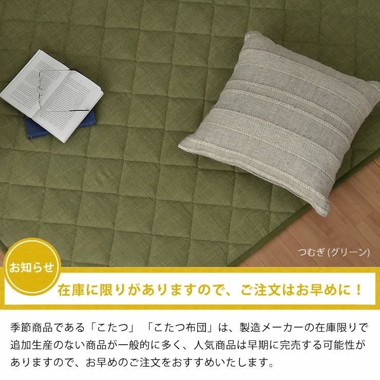 季節商品である「こたつ」 「こたつ布団」は、製造メーカーの在庫限りで追加生産のない商品が一般的に多く、人気商品は早期に完売する可能性がありますので、お早めのご注文をおすすめいたします。